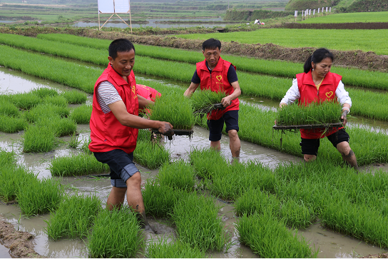 农技专家志愿者帮助农户搬运移栽到大田的秧苗
