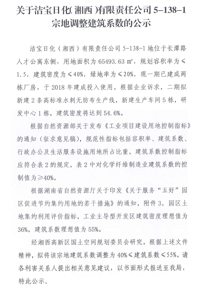 关于洁宝日化(湘西)有限责任公司宗地调整建筑系数的公示