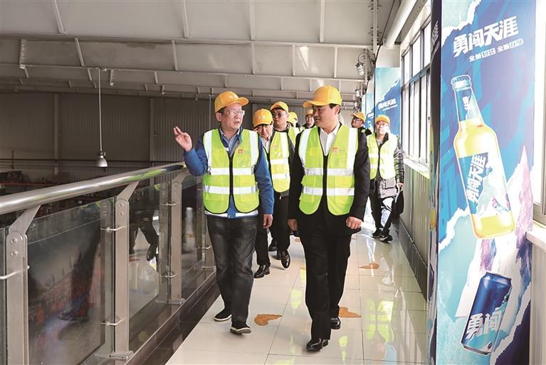 高新区党工委书记向恒林在雪花啤酒湘西工厂开展“三问三促”活动。